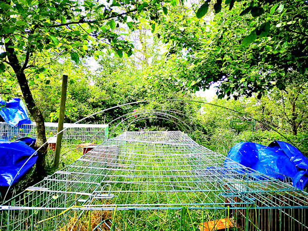 Das Gehege muss natürlich für den Aufbau des Regenschutzes geeignet sein. Ich verwende diese relativ stabilen Metallgehege, die dazu noch mit Kabelbindern verstärkt sind.